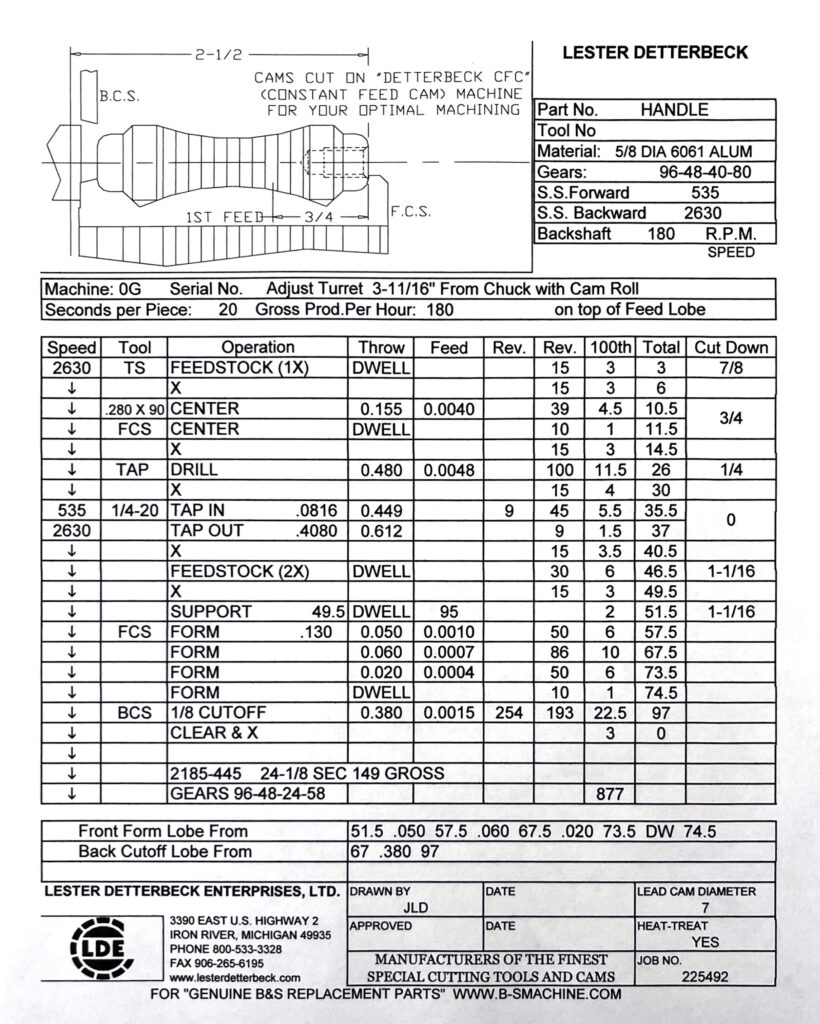 We can offer cams for Brown & Sharpe, Traubs, Index, CVA, BSA and Davenports, along with special one of a kind cam for your special applications. Layouts and time studies are also available for these and other screw machines.
