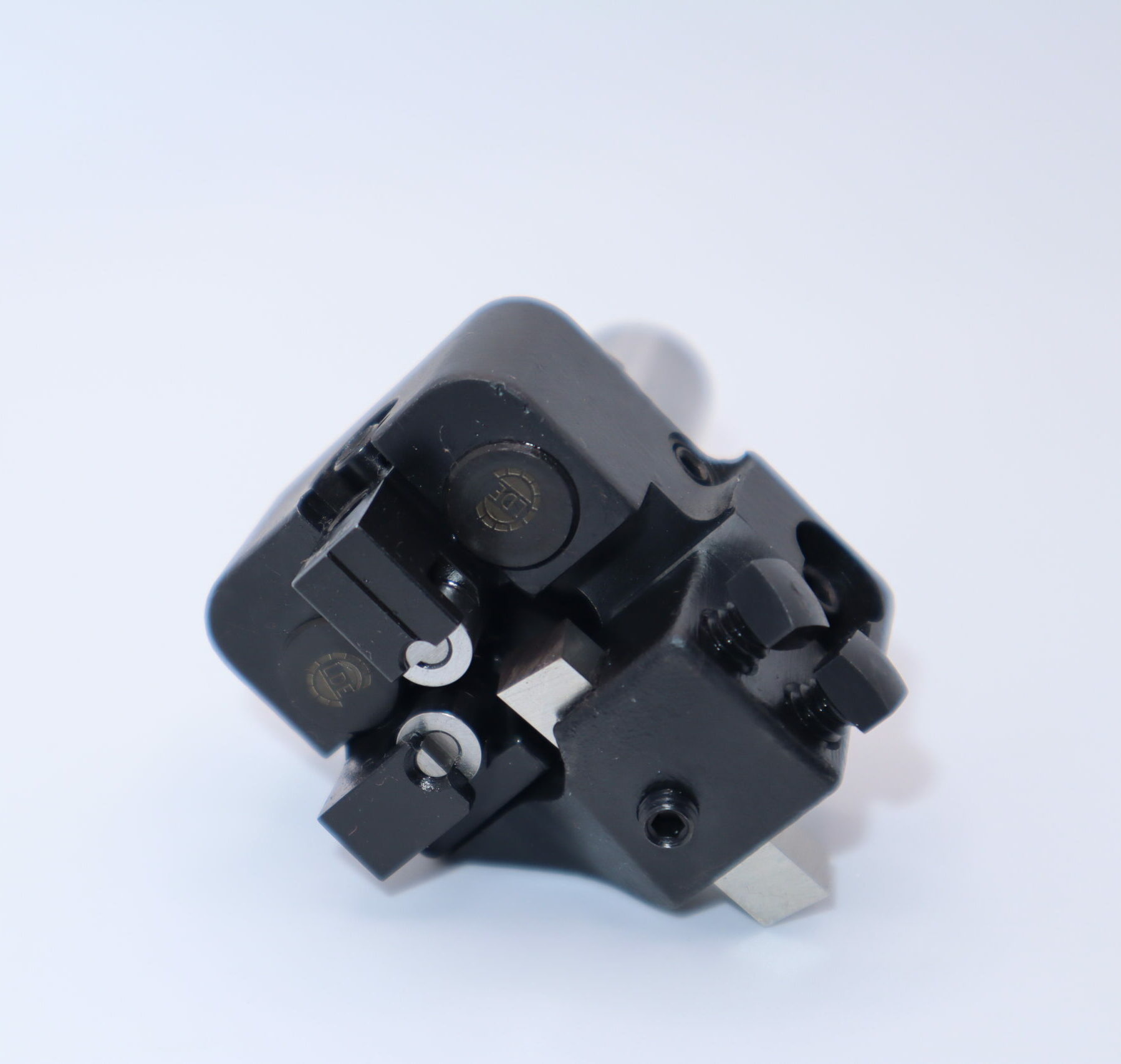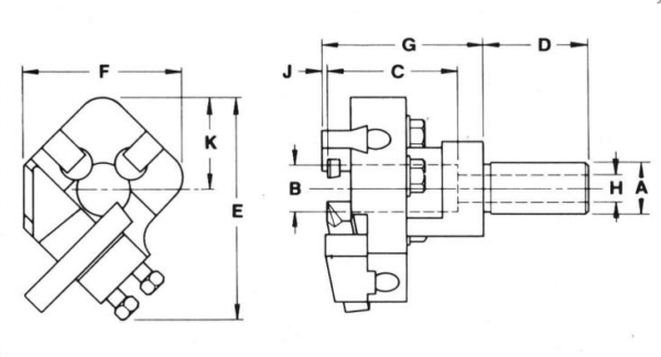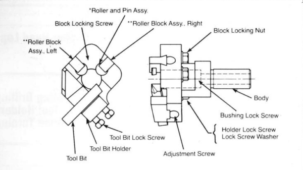 These rigid tools are designed to take a medium to heavy cut where a single pass cut is feasible, but not to exceed one-quarter of the stock diameter. The tool holder has two-axis adjustment, permitting proper orientation of tool bit to the workpiece, and ample space is provided for chip clearance and coolant flow.