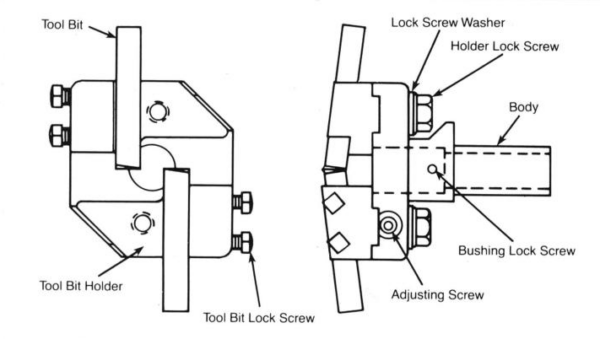 Balanced turning tools will remove a greater amount of material than any other turning tool available because of the rugged construction and dual cutting tools. The two high-speed steel blades cut freely, are inexpensive to replace, and adjustment permitting proper orientation of the tool bit to the workpiece can be made in a matter of minutes. Although designed primarily for rough turning, these tools will produce a good finish cut where a high degree of accuracy and fine finish are not necessary.