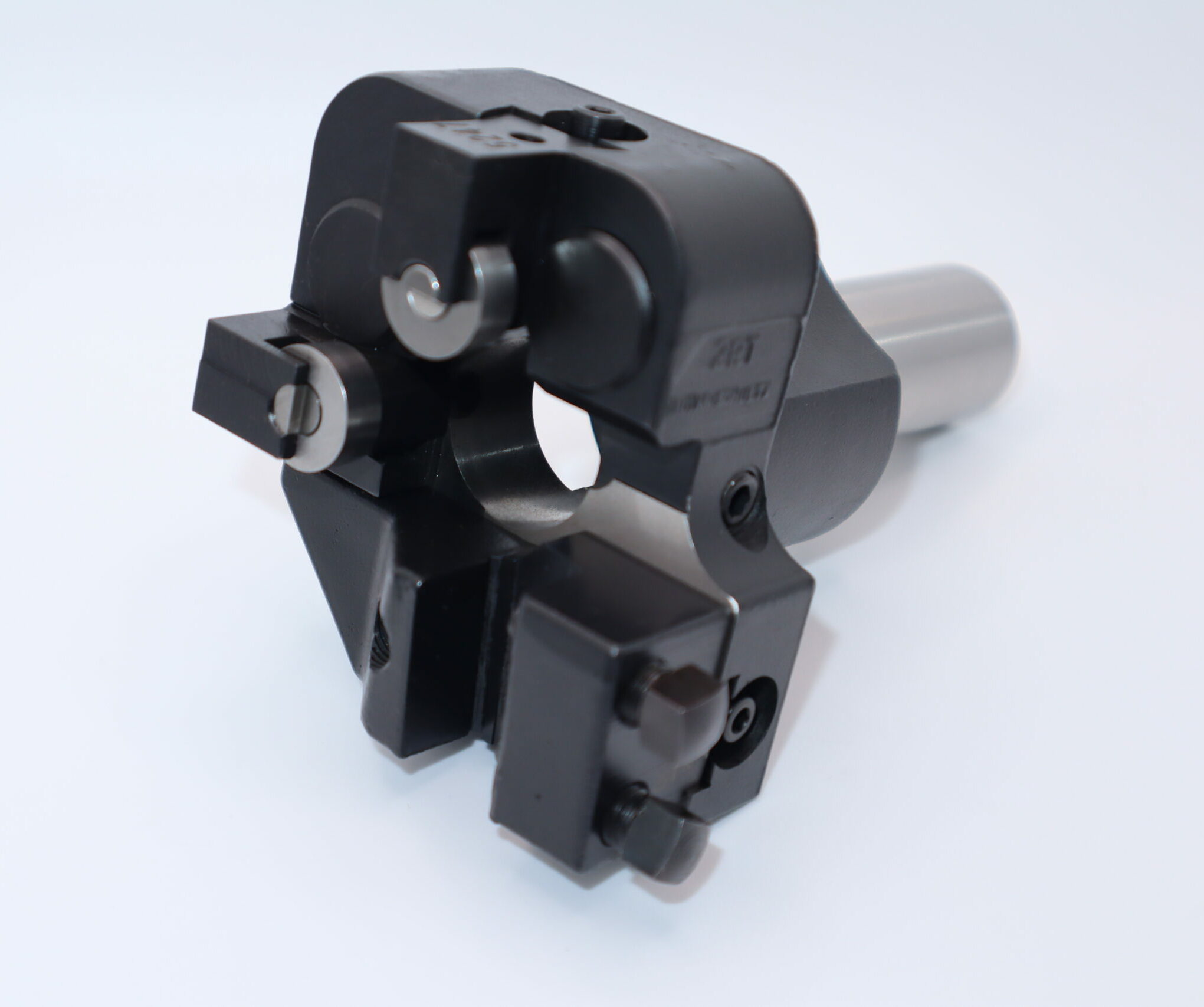 These rigid tools are designed to take a medium to heavy cut where a single pass cut is feasible, but not to exceed one-quarter of the stock diameter. The tool holder has two-axis adjustment, permitting proper orientation of tool bit to the workpiece, and ample space is provided for chip clearance and coolant flow.