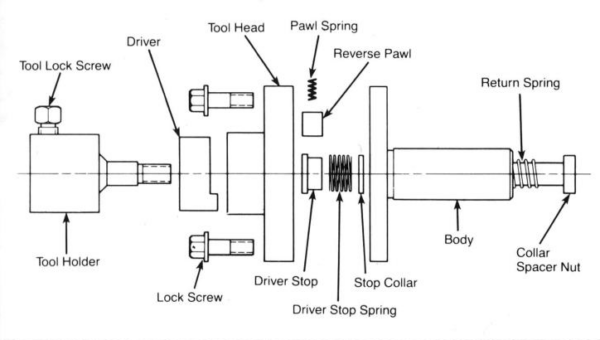The non-rotating tool holder is free to move axially, permitting the tap to lead itself after being started in the workpiece. Automatic spindle reversal withdraws the tap from the hole and a spring draws the tool holder back into the head when the tap clears the workpiece.