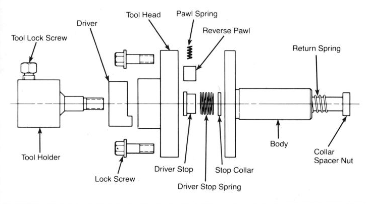 The tap is mounted in the tool holder directly or in a bushing; the holder assembly is adjustable to accurately align the tap with the workpiece. After it is started in the workpiece, the tap leads itself to a preset depth and draws the tool holder out of drive engagement with the tool head assembly, which permits the holder to rotate freely with the workpiece. Spindle reversal re-engages the tool holder, withdrawing the tap from the hole, and returns the tool holder to its original position.