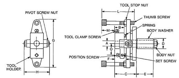 *For No. 2 machines, 3/4” capacity, use 711-225-120 with Turret Tool Adapter No. 711-260-222 or 711-260-222 or 711-261-222.     Max .Shank Max Tool Inches Tool No. Advance Swing A B C D E F G H L M O 711-225-100 3/32 8° 1/4 1/2 1-11/32 5/8 1 25/32 2-5/8 1-11/16 1-7/8 11/16 5/8 711-225-120 1/8 8° 5/16 5/8 1-19/32 3/4 1-1/2 15/16 3-5/8 1-13/16 2-5/16 1 7/8 711-225-122 5/32 8° 1/2 7/8 2 1 1-5/8 1-1/4 4-5/8 2-3/8 3-1/16 1-1/4 1-1/8